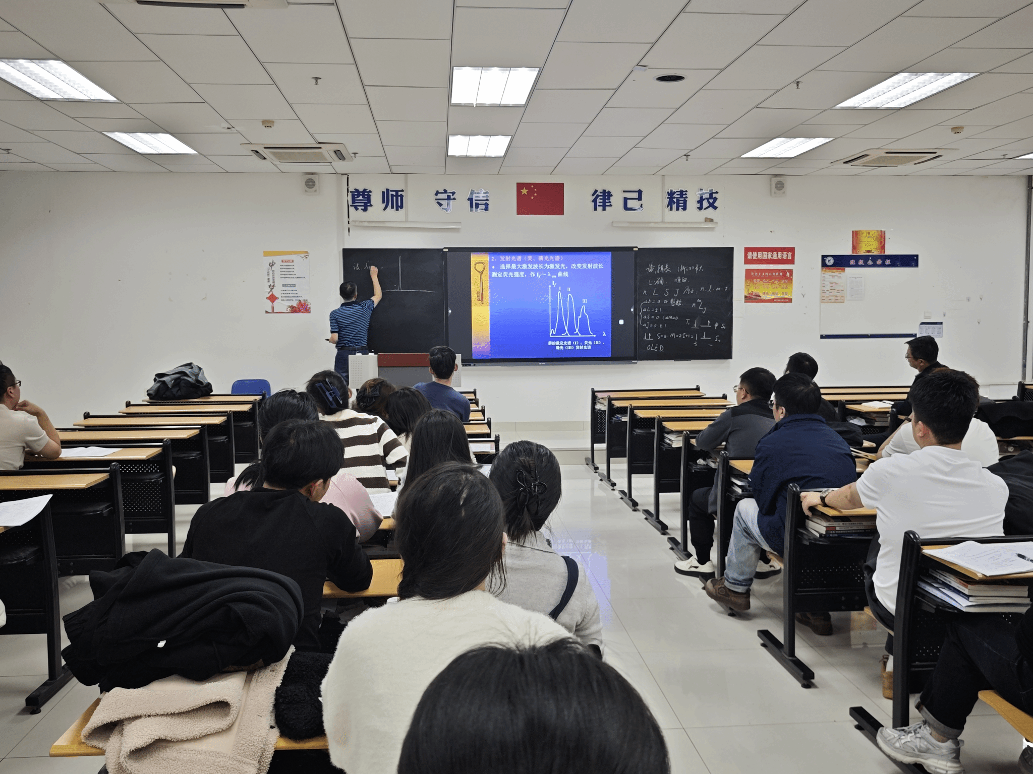 当晚虽课时较晚,但教室座无虚席,学习氛围浓厚。示范课在期待中准时开始。黄朝表教授本次主讲章节为《分子发光分析法》。他首先以生活中常见的荧光现象为引,巧妙激发听众兴趣,随后逐步深入,从基本原理、仪器构造到前沿应用与最新进展,层层剖析,逻辑清晰。
